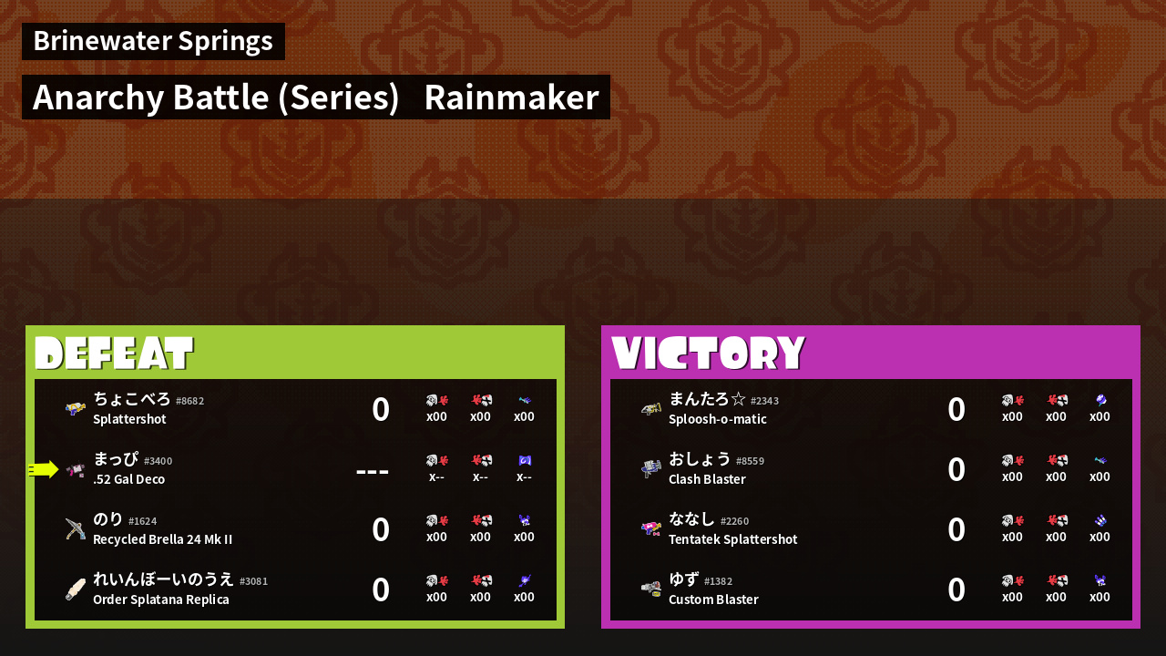 | Weapon | .52 Gal Deco ( Curling Bomb / Splattercolor Screen) |