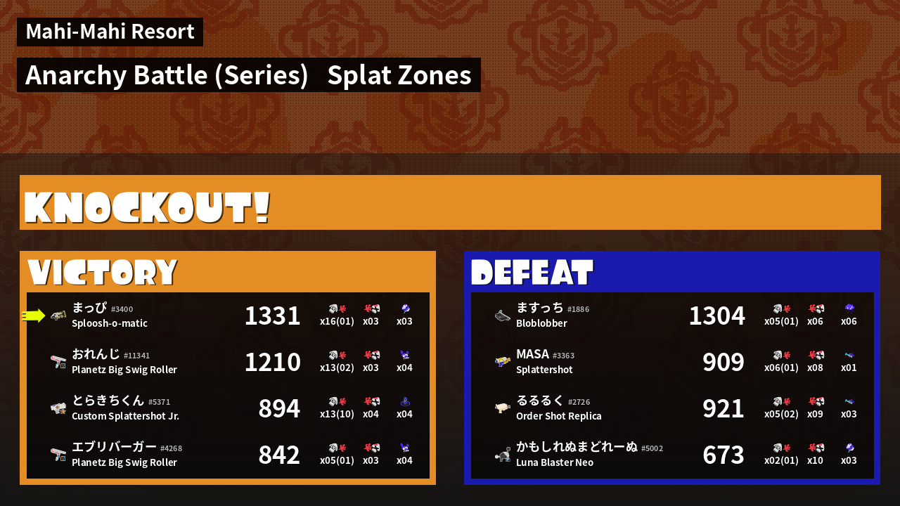 | そんなこんなでザッカ屋常連  まっぴ #3400 |  Sploosh-o-matic                    | 1,331 | 15 + 1 | 3 | 5.00 |  3 | |