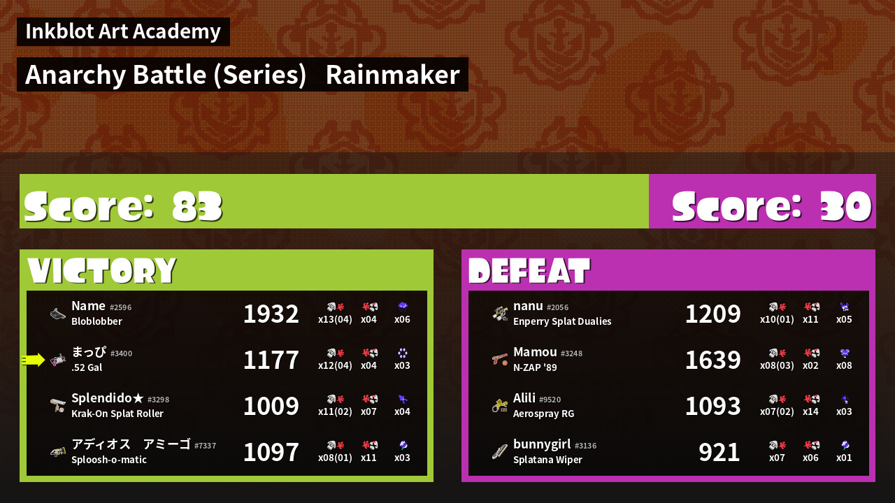 | Mode | Rainmaker - Anarchy Battle (Series) |