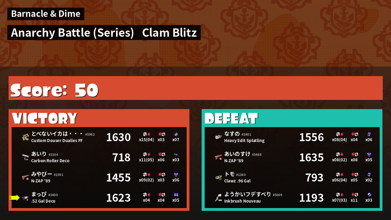| Weapon | .52 Gal Deco ( Curling Bomb / Splattercolor Screen) |