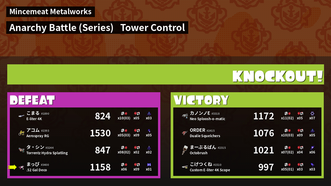 | Weapon | .52 Gal Deco ( Curling Bomb / Splattercolor Screen) |