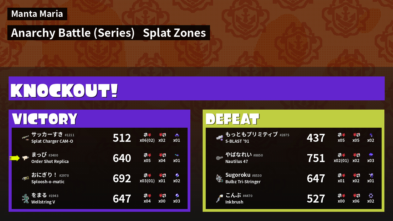 | Medals | #1 Splat Zone Guard #1 Enemy Splatter #2 Overall Splatter |