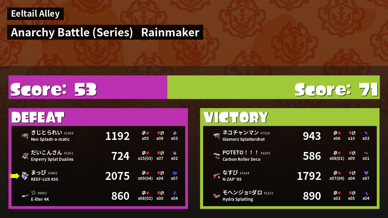 | Medals | #1 Turf Inker #1 Splat Assister #1 Ink Consumer |