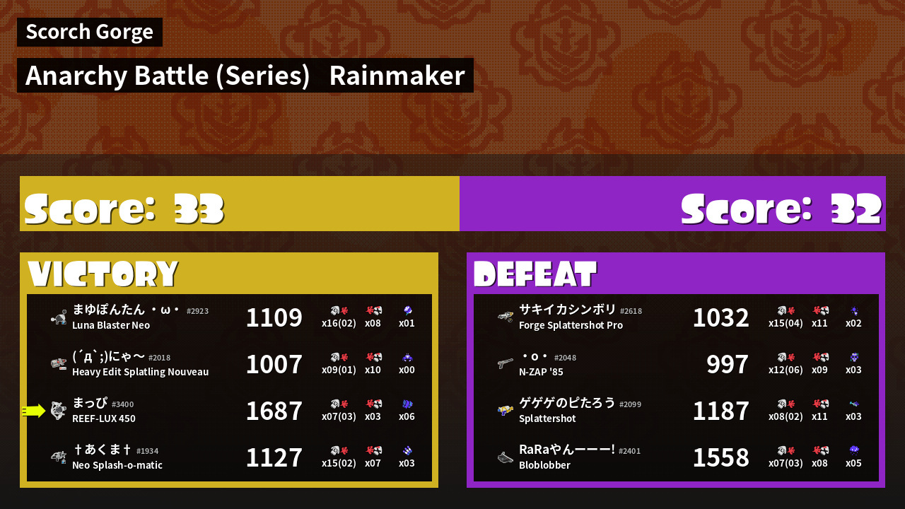 | Medals | #1 Turf Inker #1 Splat Assister #1 Ink Consumer |