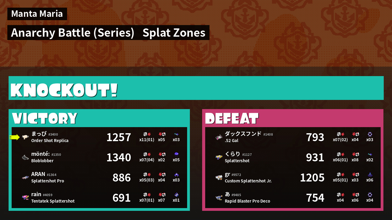 | Medals | #1 Overall Splatter #1 Splat Zone Guard #1 Enemy Splatter |