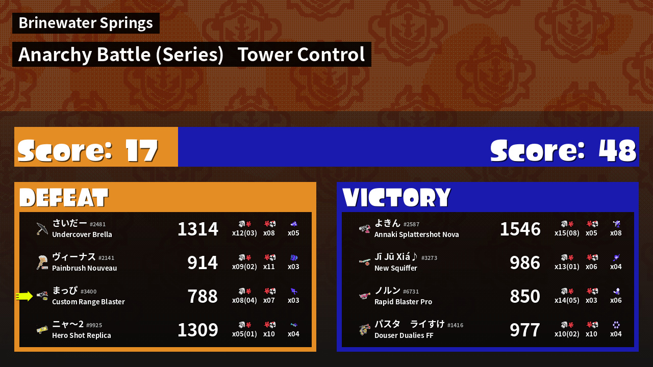 | Medals | #1 Super Jump Spot #1 Splat Assister #1 Damage Taker |