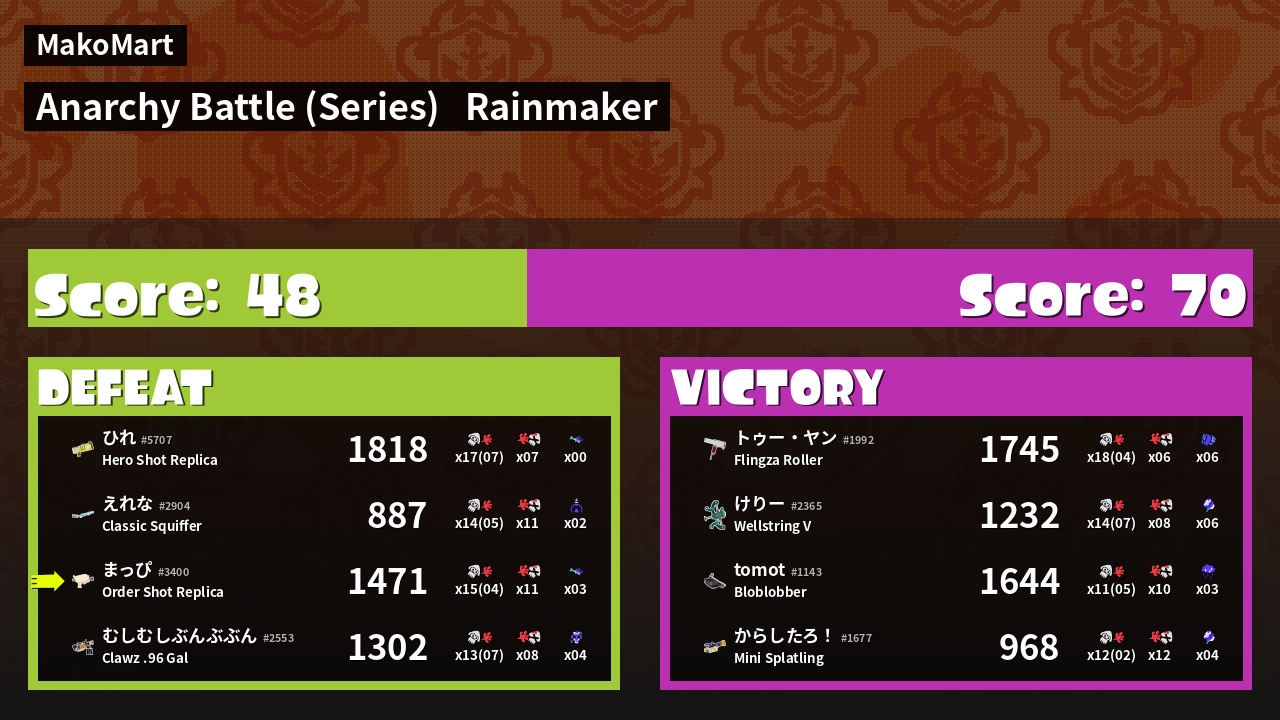 | Mode | Rainmaker - Anarchy Battle (Series) |