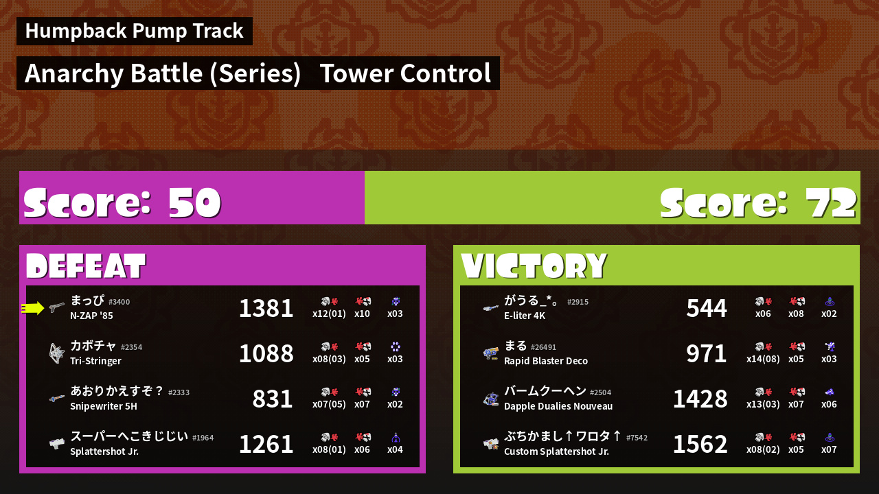 | Medals | #1 Overall Splatter #1 Turf Inker #1 Enemy Splatter |