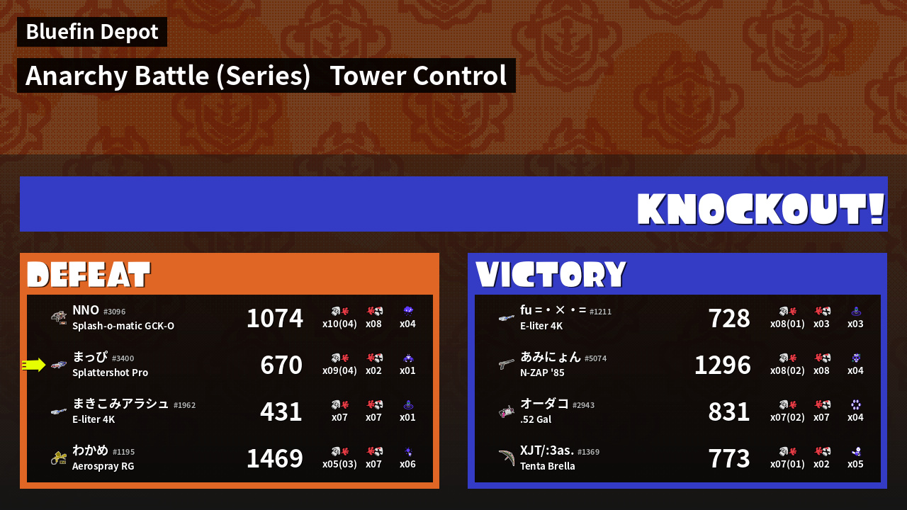 | Weapon | Splattershot Pro ( Angle Shooter / Crab Tank) |