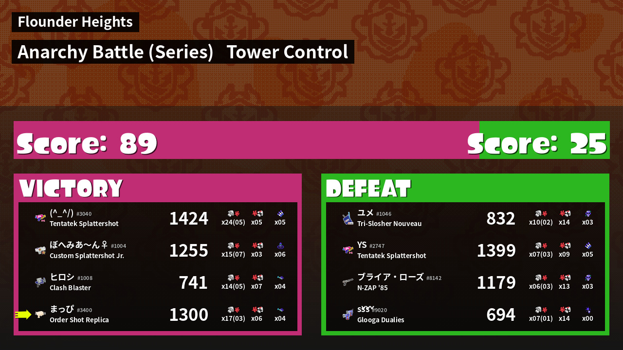 | Medals | #1 Tower Stopper #1 Trizooka User #2 Overall Splatter |