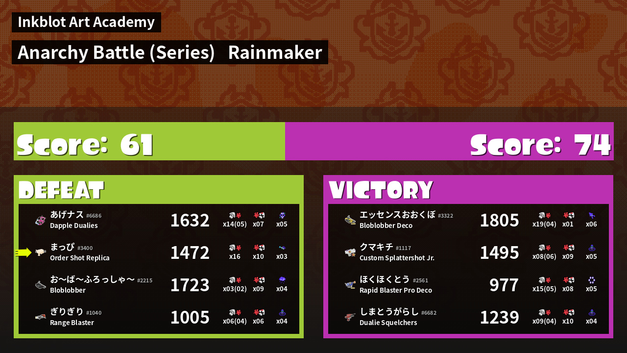 | Mode | Rainmaker - Anarchy Battle (Series) |