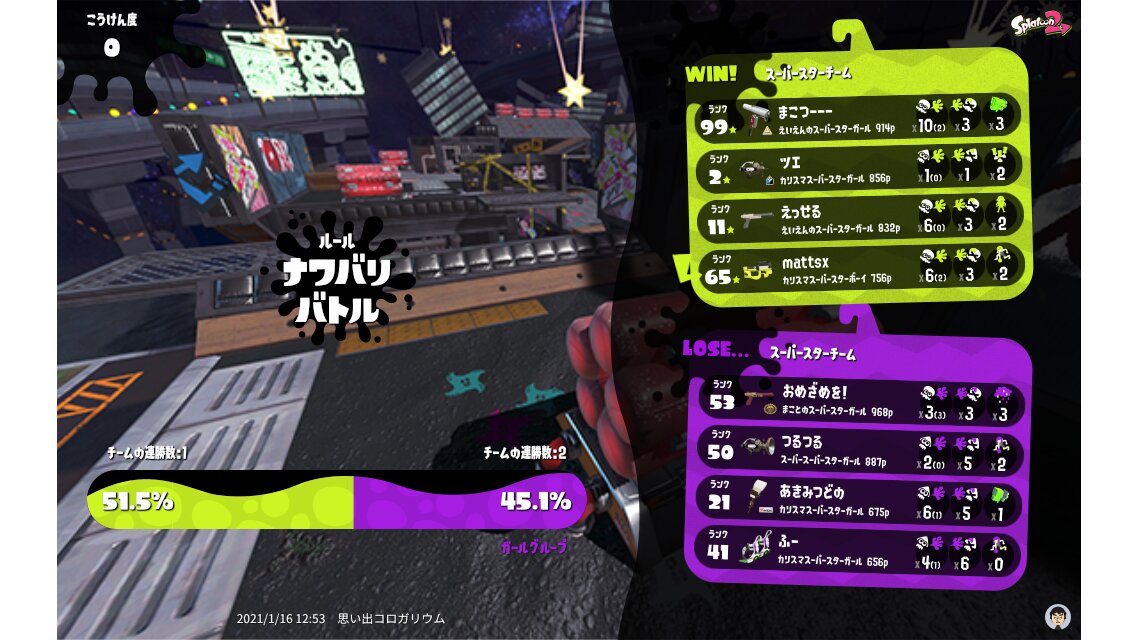 | Splatfest Title | スーパースター Champion 38 → スーパースター Champion 108 | |||||||||||||||||||||||||||||||||||||||||||