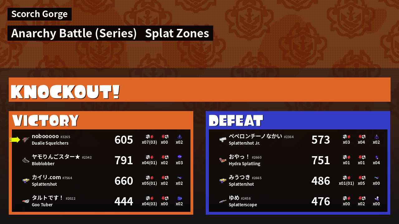 | Medals | #1 Overall Splatter #1 Splat Zone Guard #1 Super Jump Spot | ||