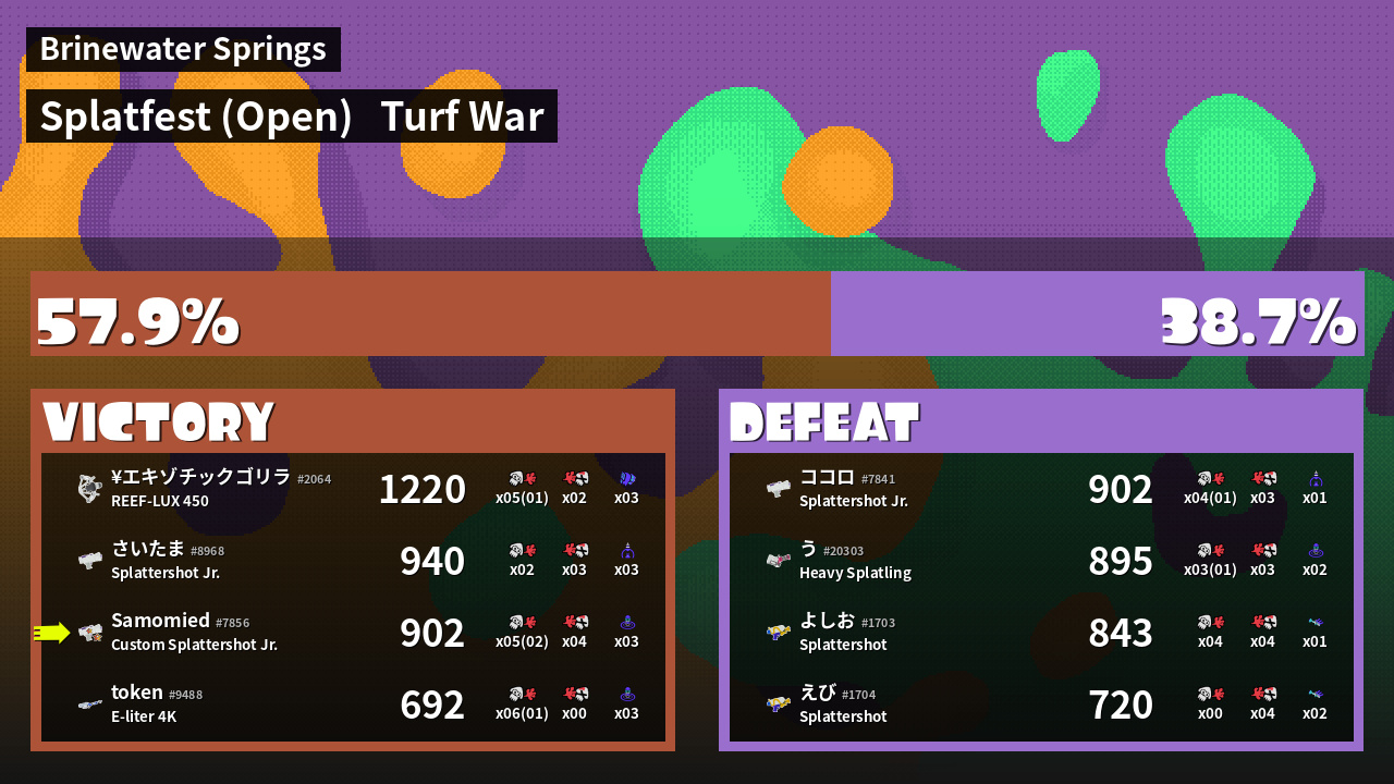 | Medals | #1 Splat Assister #1 Base Defender #1 Wave Breaker User | ||
