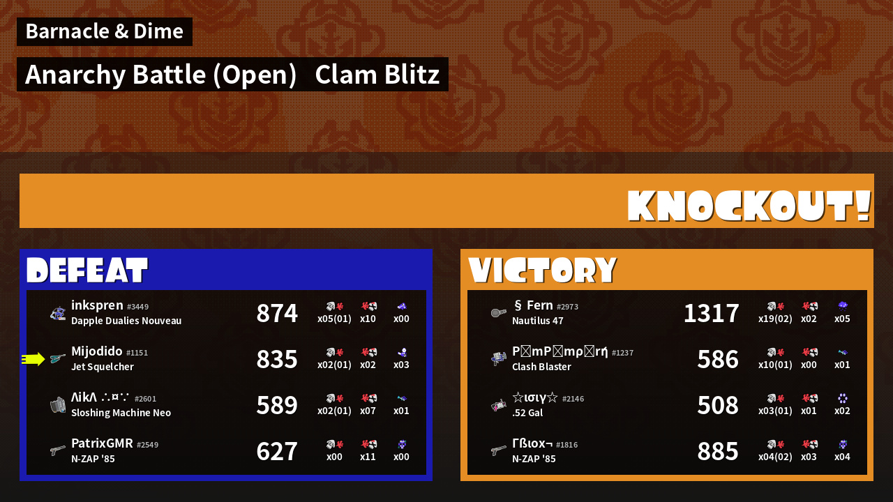 | Mode | Clam Blitz - Anarchy Battle (Open) | ||