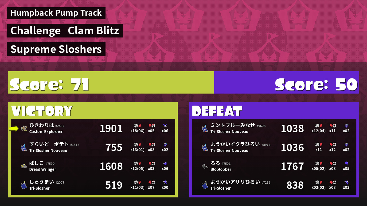 | Medals | #1 Overall Splatter #1 Turf Inker #1 Enemy Splatter | ||