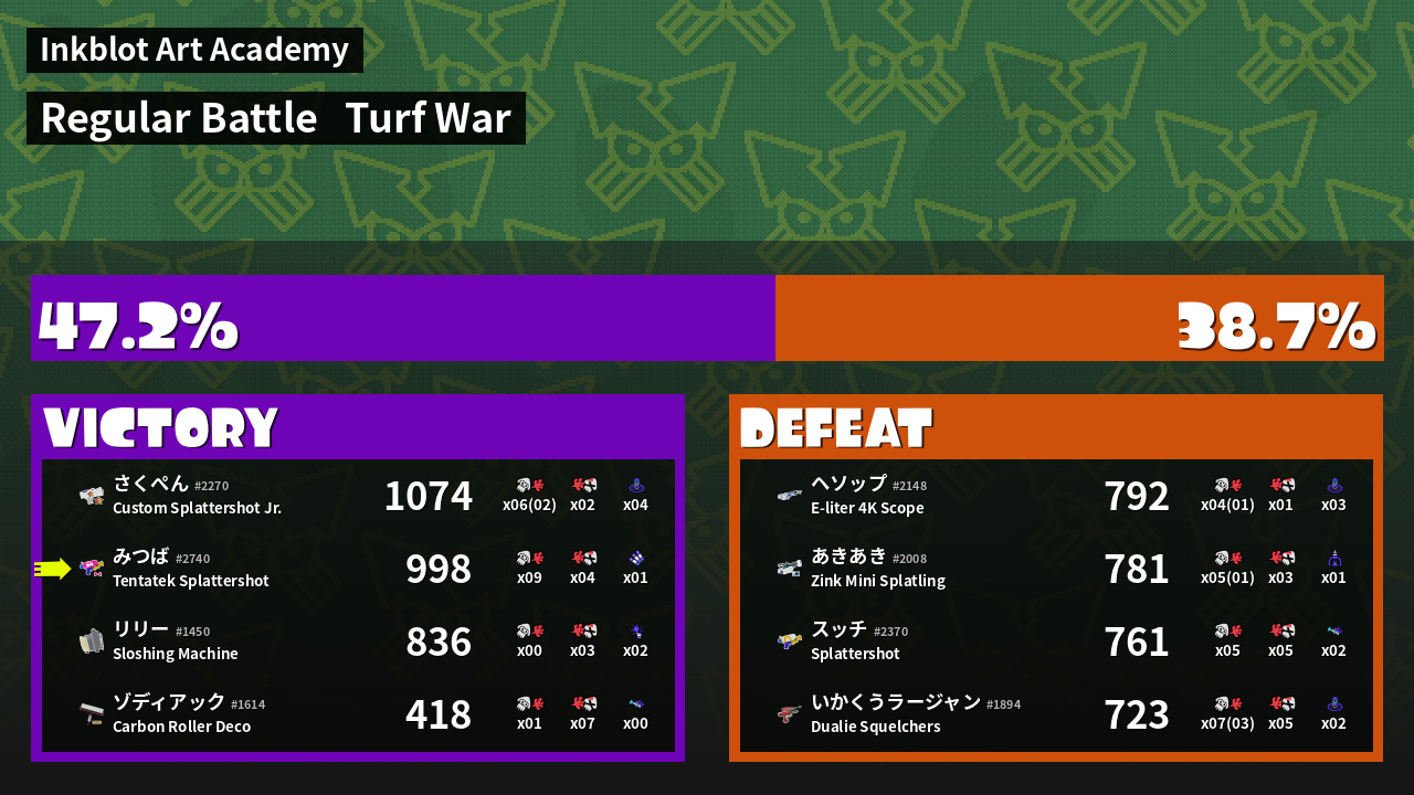 Kills / Deaths | 9 + 0 / 4 > Kill Ratio: 2.25 | ||