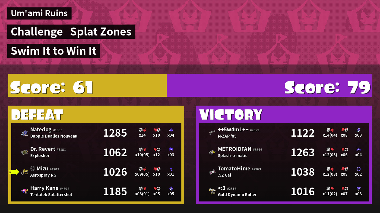 | Medals | #1 Splat Zone Inker #1 Splat Assister #2 Splat Zone Guard | ||