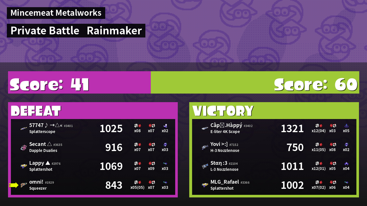 | Medals | #1 Splat Assister #1 Ink Consumer #2 Popular Target | ||