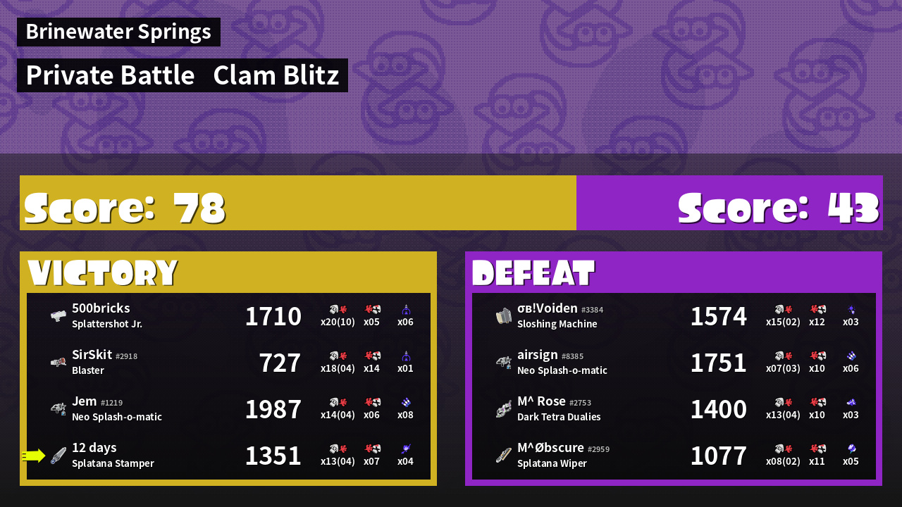 | Medals |  #2 Clam Carrier  #2 Popular Target  #2 Splat Assister | ||