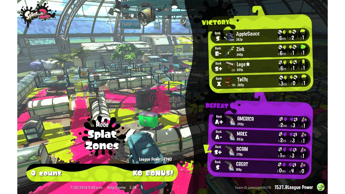 | Mode | Splat Zones - League Battle (Quad) | ||||||||||||||||||||||||||||||||||||||||||||||