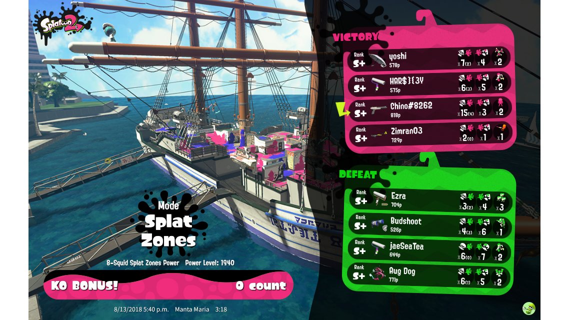 | Mode | Splat Zones - Ranked Battle | ||||||||||||||||||||||||||||||||||
