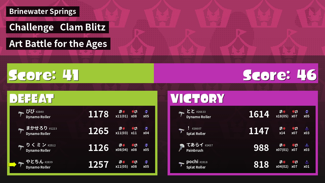 | Medals | #1 Overall Splatter #1 Splat Assister #1 Clam Stopper | ||