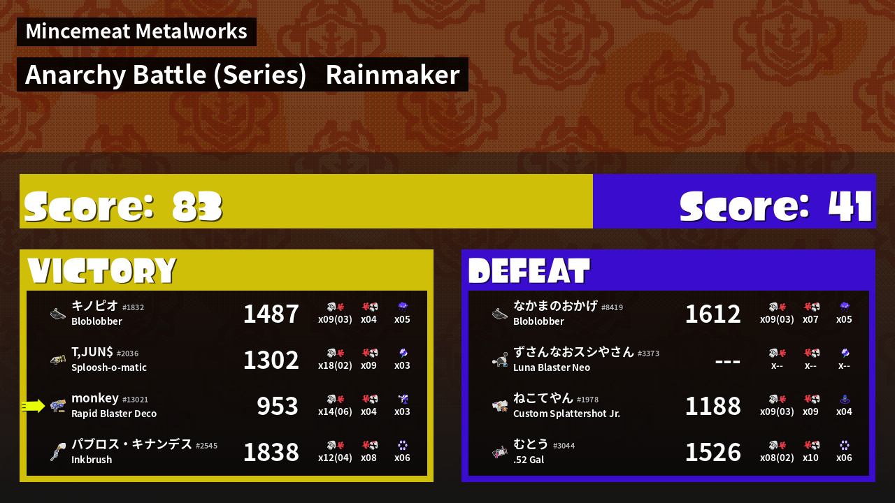| Medals | #1 Super Jump Spot #1 Splat Assister #1 Inkjet User | ||