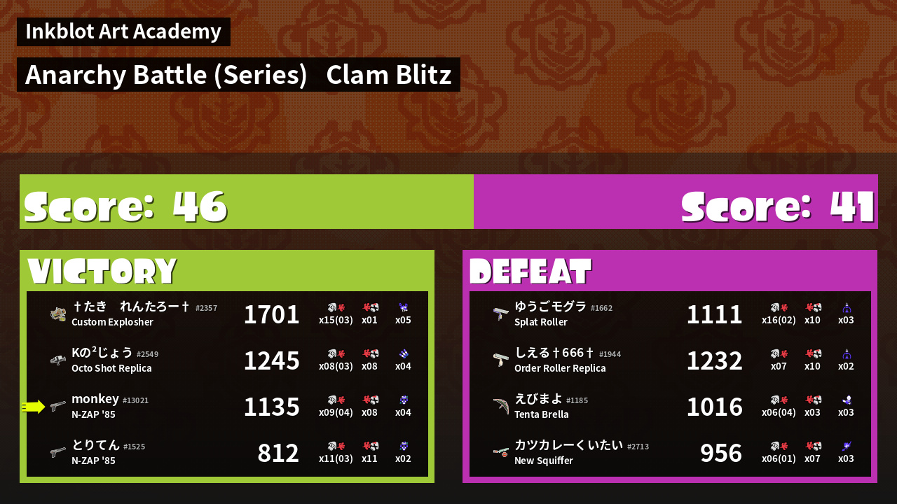 | Medals | #1 Score Booster #1 Splat Assister #1 Clam Stopper | ||