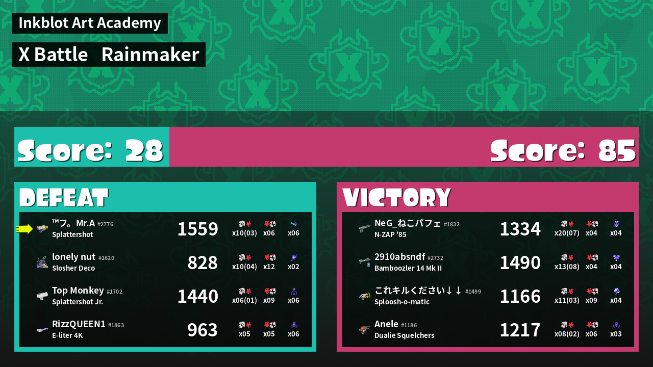 | Medals | #1 Overall Splatter #1 Turf Inker #1 Enemy Splatter | ||