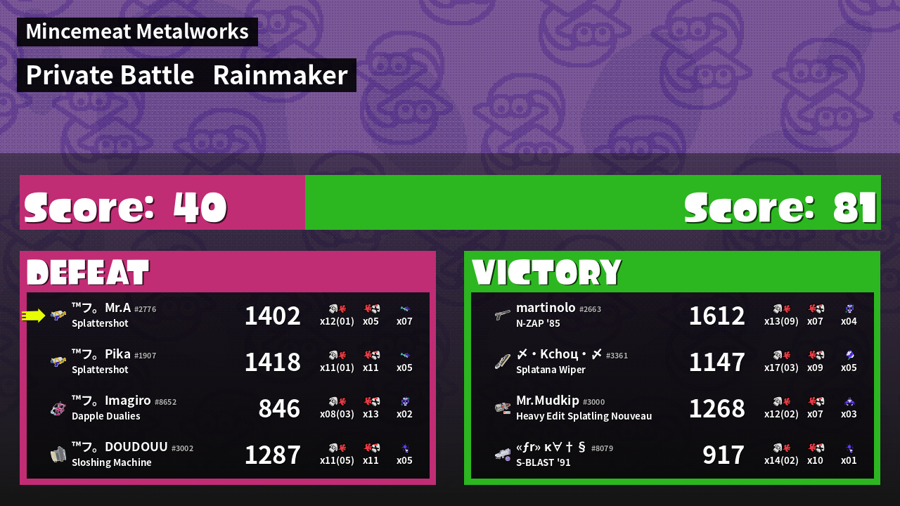 Kills / Deaths | 11 + 1 / 5 > Kill Ratio: 2.20 | ||