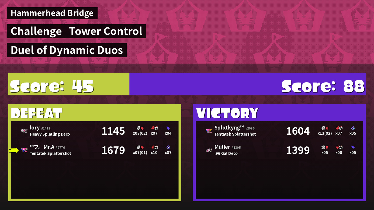 | Medals | #1 Turf Inker #1 Enemy Splatter #1 Ground Traveler | ||