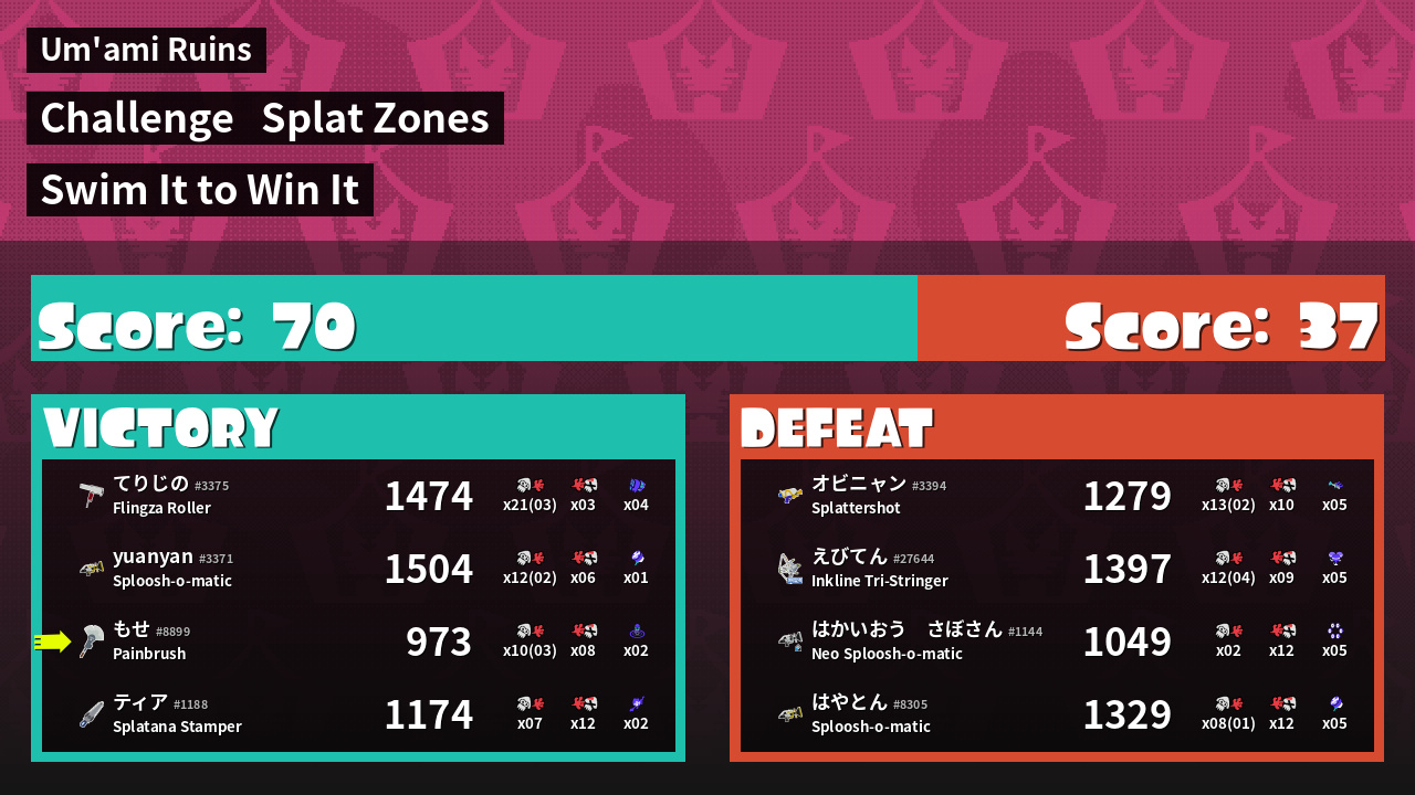 | Medals | #1 Splat Assister #1 Ground Traveler #1 Ink Consumer | ||