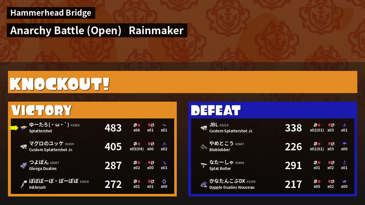| Medals | #1 Overall Splatter #1 Turf Inker #1 Enemy Splatter | ||