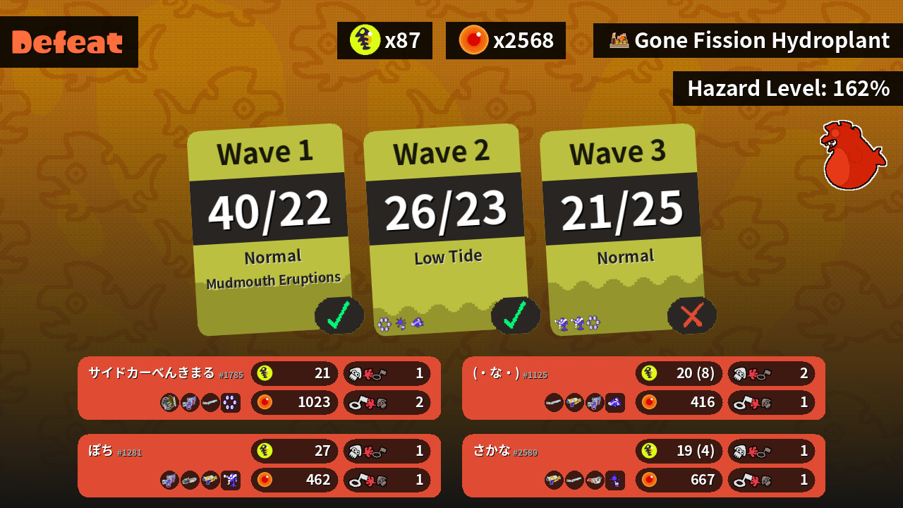 | Weapons | Grizzco Slosher Glooga Dualies Classic Squiffer | Glooga Dualies Ballpoint Splatling Splattershot | Classic Squiffer Splattershot Glooga Dualies | Splattershot Classic Squiffer Goo Tuber |