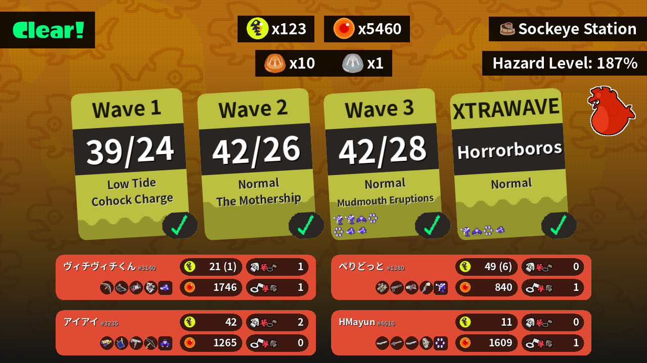 | Weapons | Tenta Brella Bloblobber .52 Gal REEF-LUX 450 | Grizzco Dualies N-ZAP '85 Blaster Inkbrush | Splattershot Tri-Slosher Dynamo Roller Undercover Brella | Classic Squiffer Snipewriter 5H Classic Squiffer Grizzco Stringer |