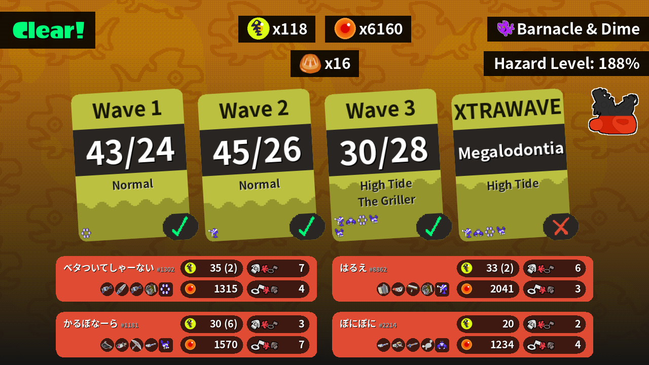 | Weapons | H-3 Nozzlenose Splatana Stamper H-3 Nozzlenose Grizzco Slosher | Sloshing Machine Goo Tuber Carbon Roller Grizzco Slosher | Bloblobber .96 Gal Splat Brella E-liter 4K | E-liter 4K Grizzco Blaster Snipewriter 5H Luna Blaster |