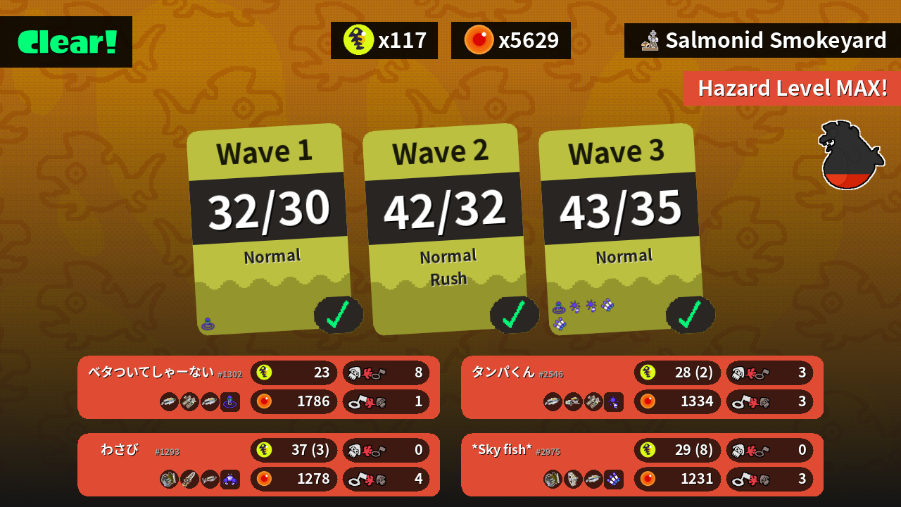 | Weapons | Grizzco Brella Grizzco Dualies Grizzco Brella | Grizzco Slosher Grizzco Splatana Grizzco Charger | Grizzco Slosher Grizzco Stringer Grizzco Brella | Grizzco Brella Grizzco Blaster Grizzco Dualies |
