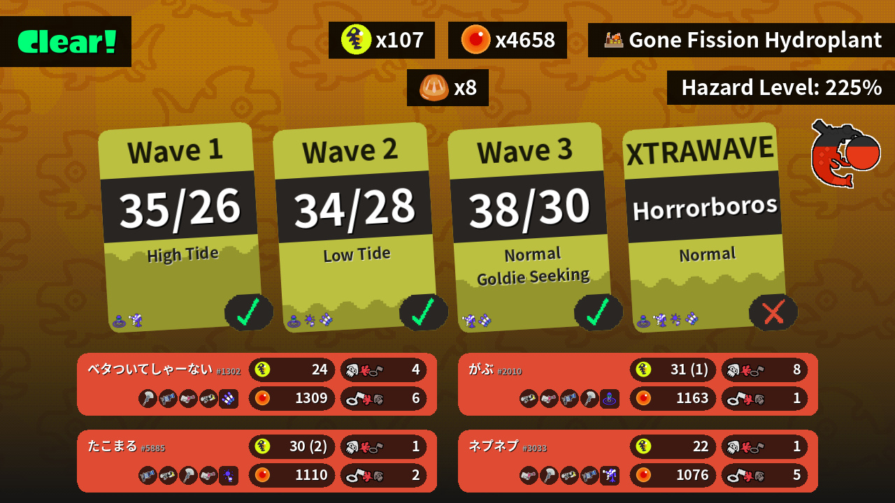 | Weapons | Painbrush L-3 Nozzlenose Heavy Splatling Splattershot Nova | Splattershot Nova Heavy Splatling L-3 Nozzlenose Painbrush | L-3 Nozzlenose Splattershot Nova Painbrush Heavy Splatling | Heavy Splatling Painbrush Splattershot Nova L-3 Nozzlenose |