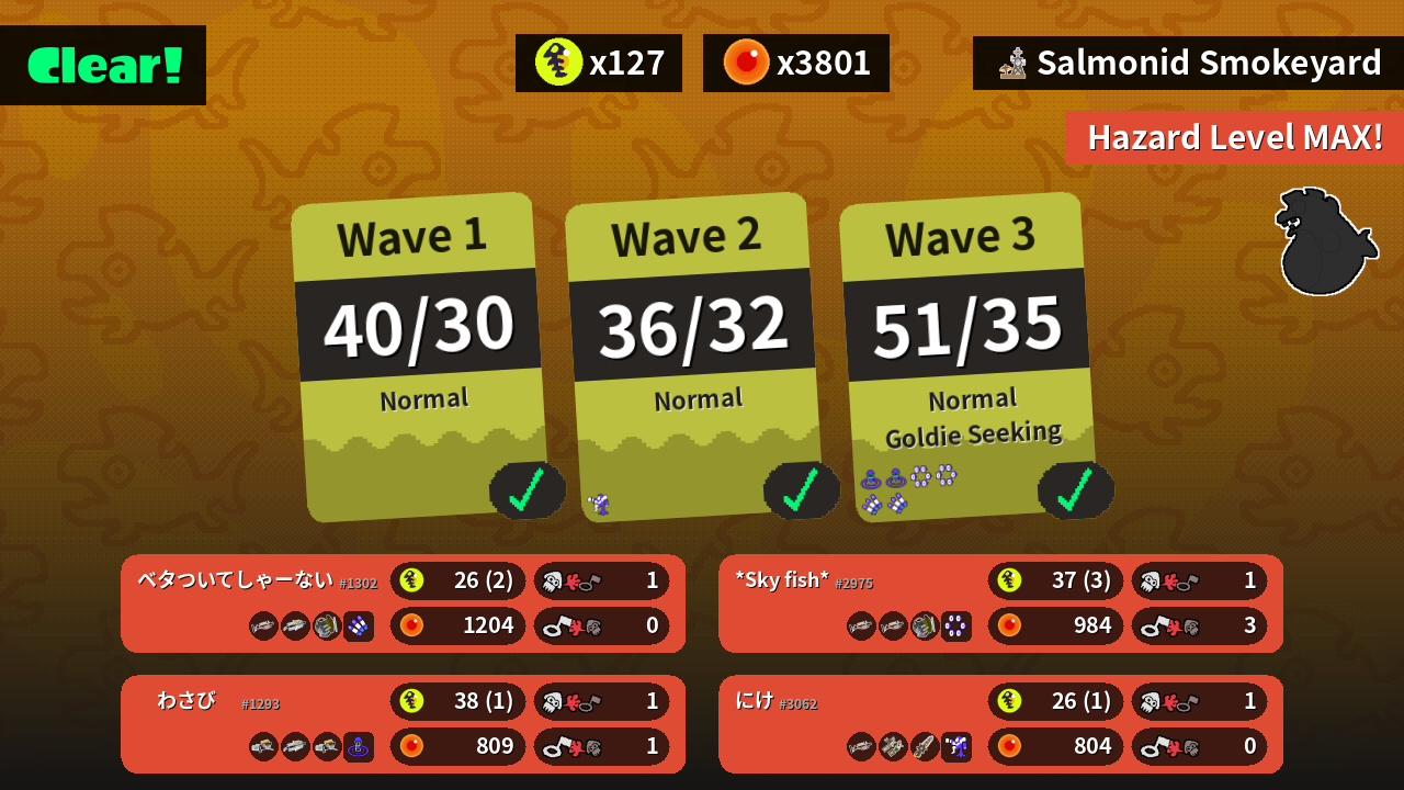 | Weapons | Grizzco Charger Grizzco Brella Grizzco Slosher | Grizzco Blaster Grizzco Brella Grizzco Blaster | Grizzco Charger Grizzco Charger Grizzco Slosher | Grizzco Charger Grizzco Dualies Grizzco Splatana |