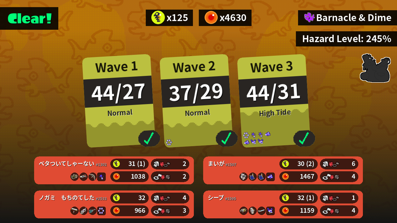 | Weapons | Explosher Range Blaster Tenta Brella | Splash-o-matic Grizzco Stringer Classic Squiffer | Carbon Roller Dark Tetra Dualies Jet Squelcher | REEF-LUX 450 Tri-Slosher Tri-Slosher |