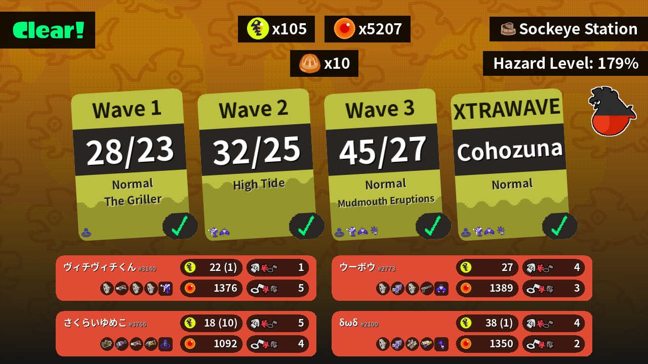 | Weapons | Grizzco Stringer Range Blaster Grizzco Stringer Grizzco Stringer | Grizzco Stringer Glooga Dualies Grizzco Dualies Splattershot | Grizzco Stringer Glooga Dualies Grizzco Stringer N-ZAP '85 | Explosher H-3 Nozzlenose Range Blaster Sploosh-o-matic |