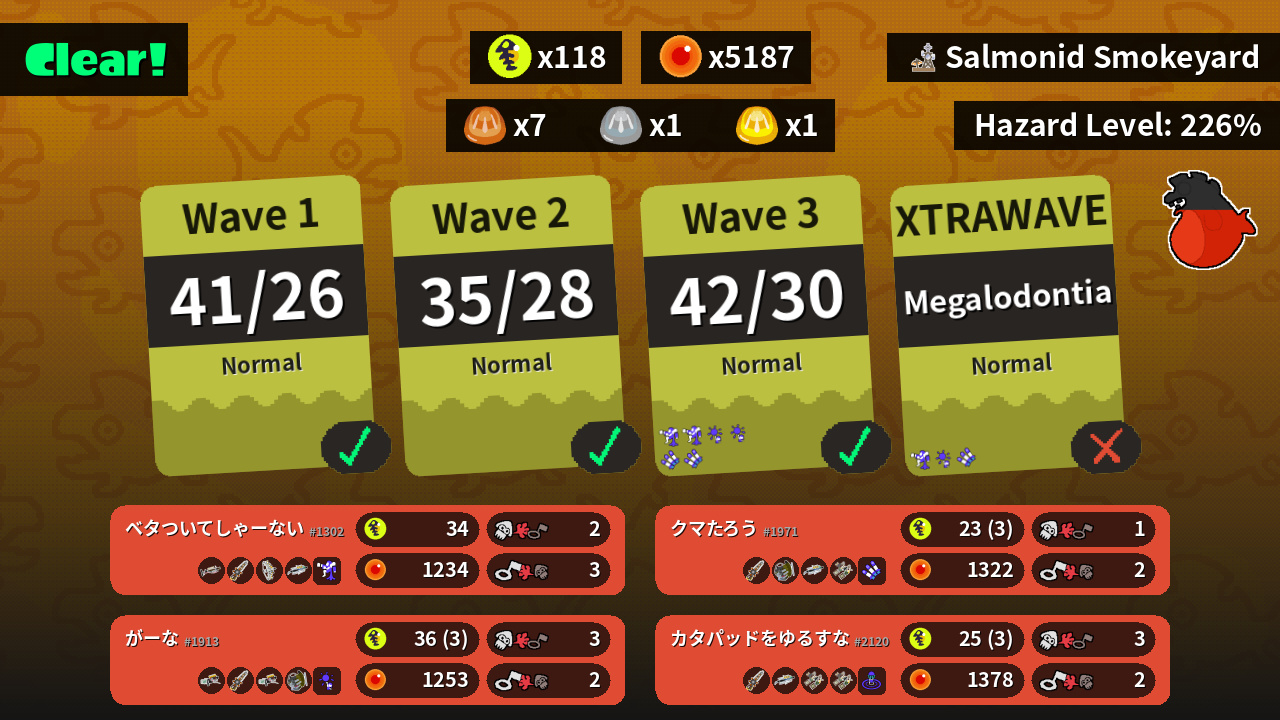 | Weapons | Grizzco Charger Grizzco Splatana Grizzco Stringer Grizzco Brella | Grizzco Blaster Grizzco Splatana Grizzco Blaster Grizzco Slosher | Grizzco Splatana Grizzco Brella Grizzco Dualies Grizzco Dualies | Grizzco Splatana Grizzco Slosher Grizzco Brella Grizzco Dualies |