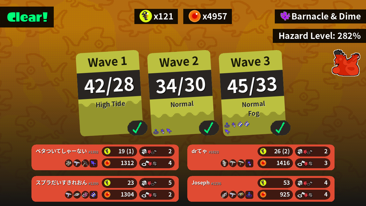 | Weapons | Grizzco Dualies Big Swig Roller Undercover Brella | Dark Tetra Dualies Big Swig Roller Splash-o-matic | Grizzco Stringer Dynamo Roller Carbon Roller | Big Swig Roller Grizzco Brella Dapple Dualies |