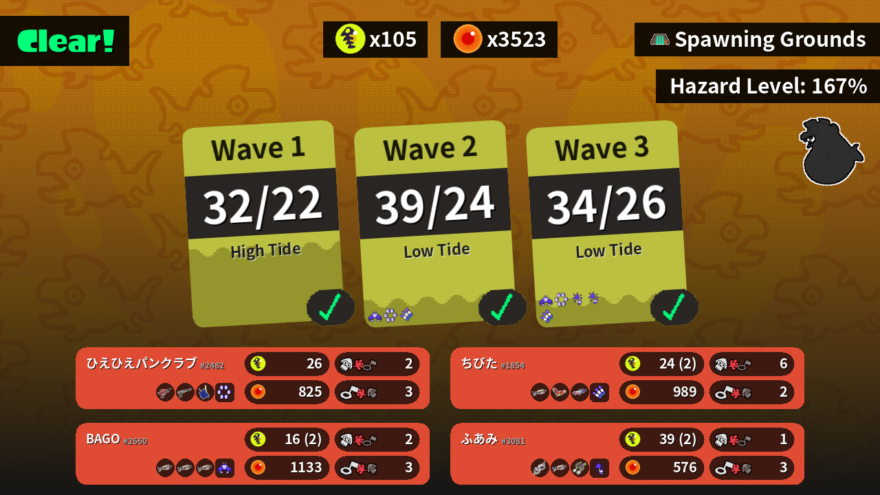 | Weapons | Dualie Squelchers N-ZAP '85 Tri-Slosher | Dark Tetra Dualies Grizzco Charger Splat Dualies | Grizzco Charger Hydra Splatling Splattershot Pro | Grizzco Charger Grizzco Charger Grizzco Charger |