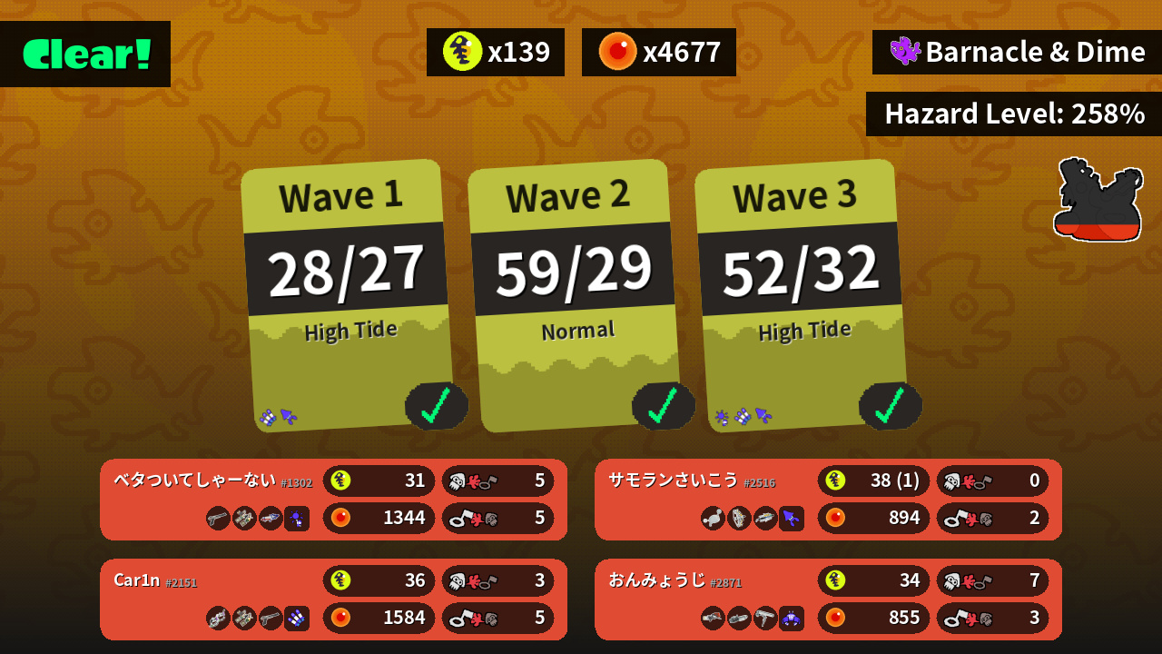 | Weapons | N-ZAP '85 Grizzco Dualies Splattershot Pro | Luna Blaster Grizzco Stringer Grizzco Brella | Dark Tetra Dualies Grizzco Dualies N-ZAP '85 | Range Blaster Ballpoint Splatling Dynamo Roller |