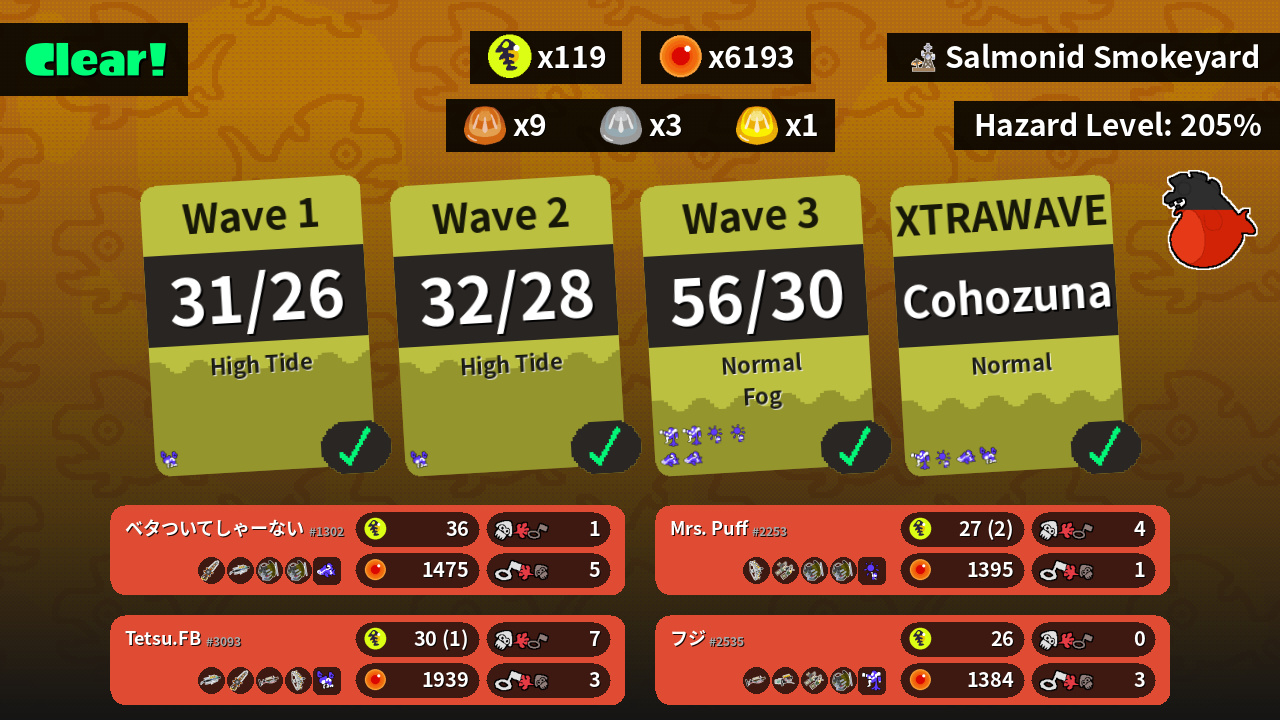 | Weapons | Grizzco Splatana Grizzco Brella Grizzco Slosher Grizzco Slosher | Grizzco Brella Grizzco Splatana Grizzco Charger Grizzco Stringer | Grizzco Stringer Grizzco Dualies Grizzco Slosher Grizzco Slosher | Grizzco Charger Grizzco Blaster Grizzco Dualies Grizzco Slosher |