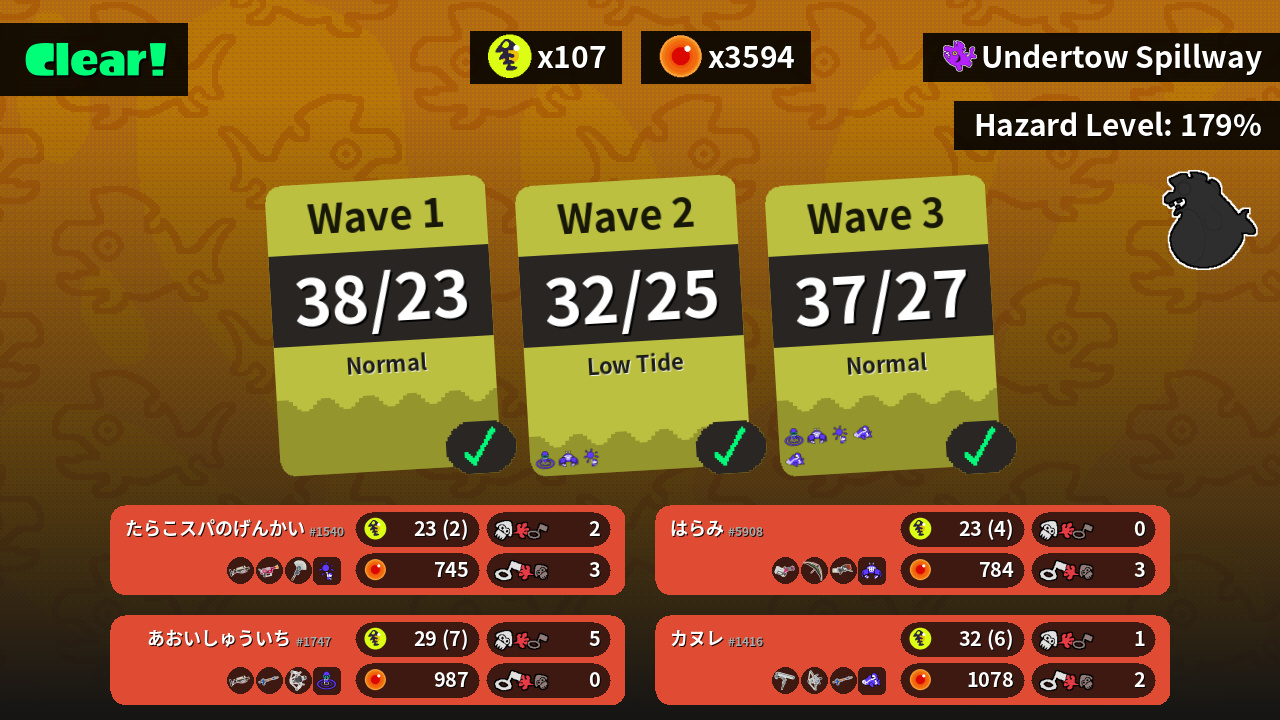 | Weapons | Grizzco Charger Rapid Blaster Pro Painbrush | Dynamo Roller Tri-Stringer Snipewriter 5H | Grizzco Charger Snipewriter 5H REEF-LUX 450 | Heavy Splatling Tenta Brella Range Blaster |