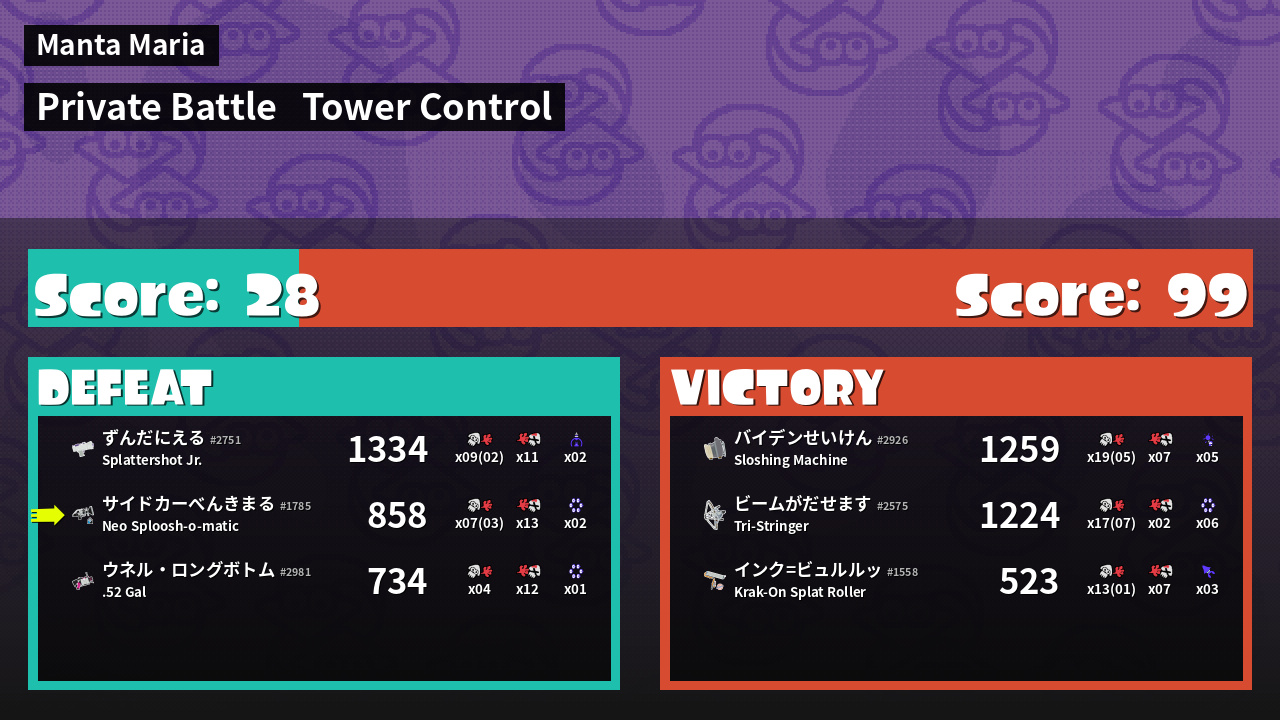 | Medals | #1 Splat Assister #1 Tower Stopper #1 Ink Consumer | ||
