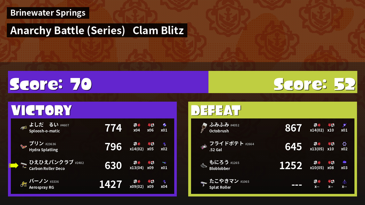 | Weapon | Carbon Roller Deco ( Burst Bomb / Trizooka) | ||